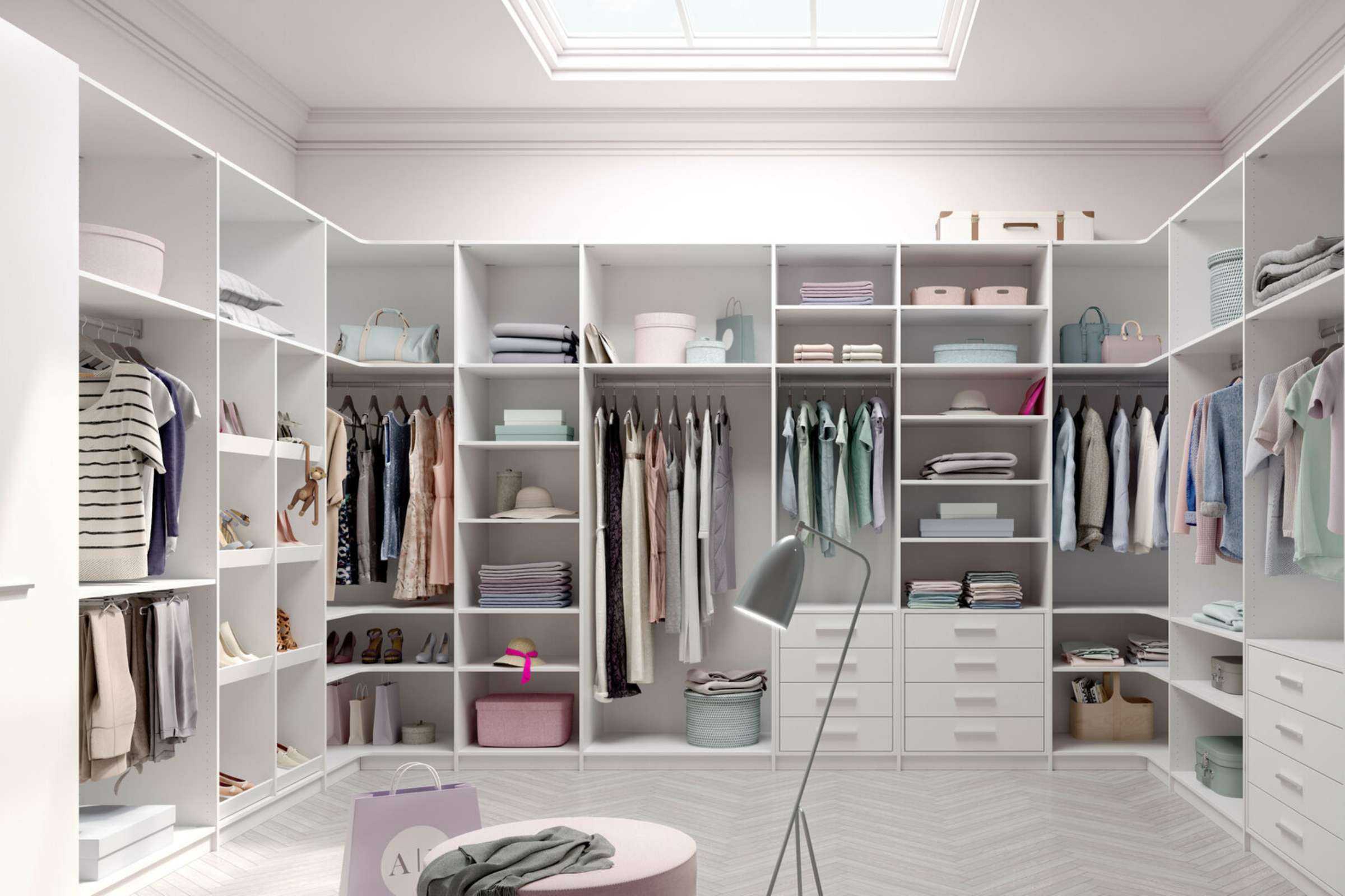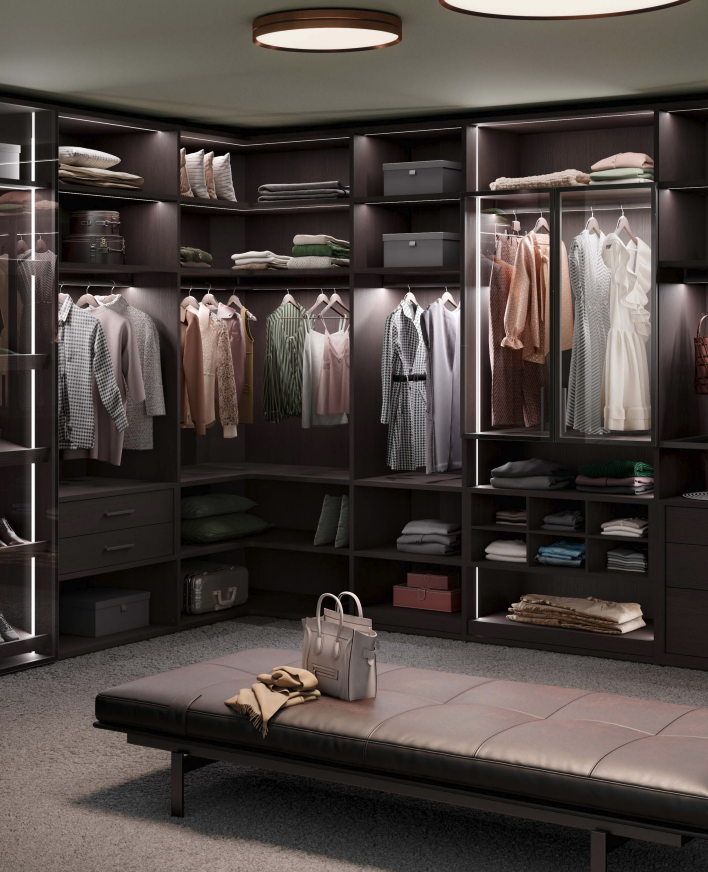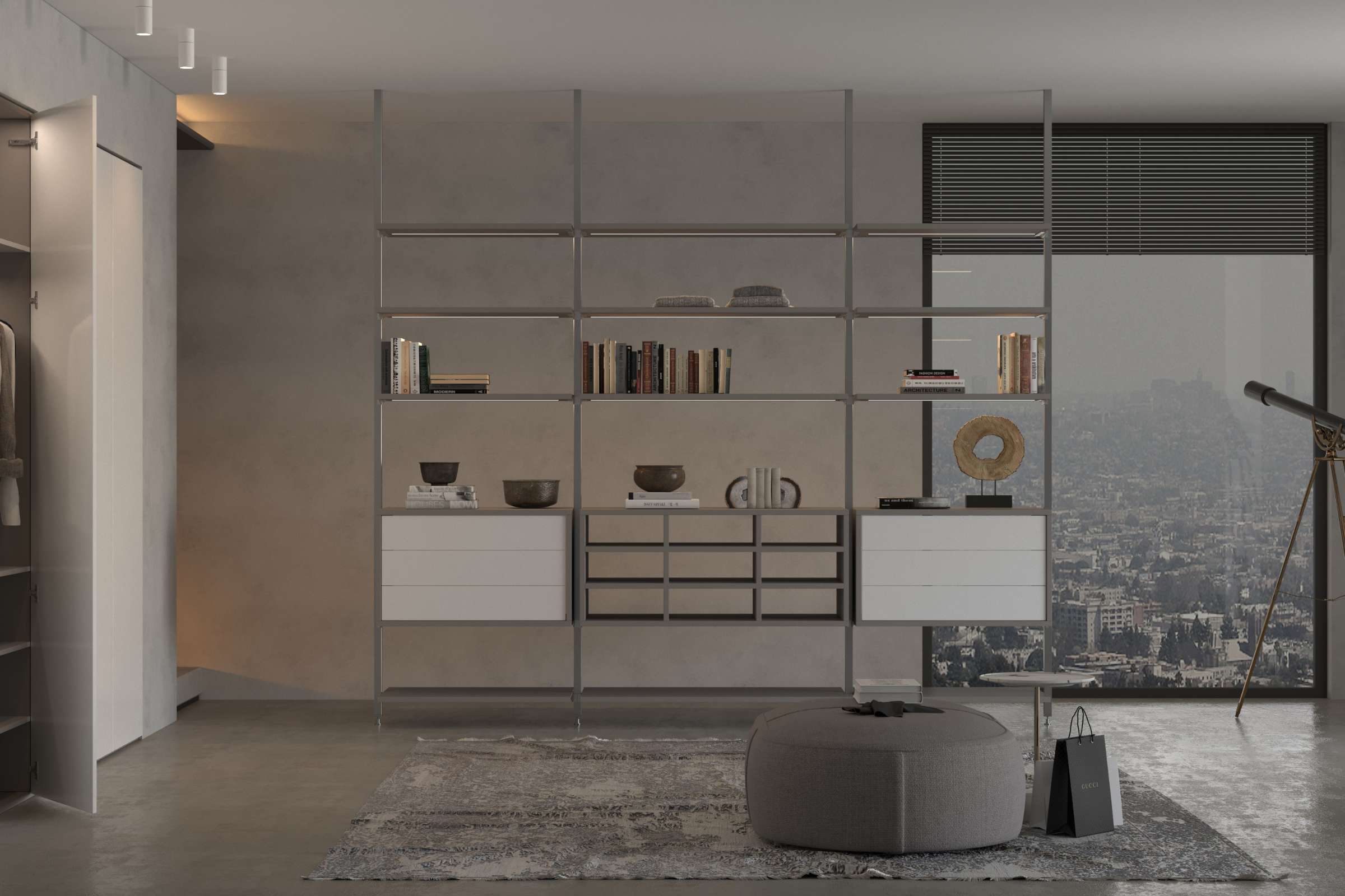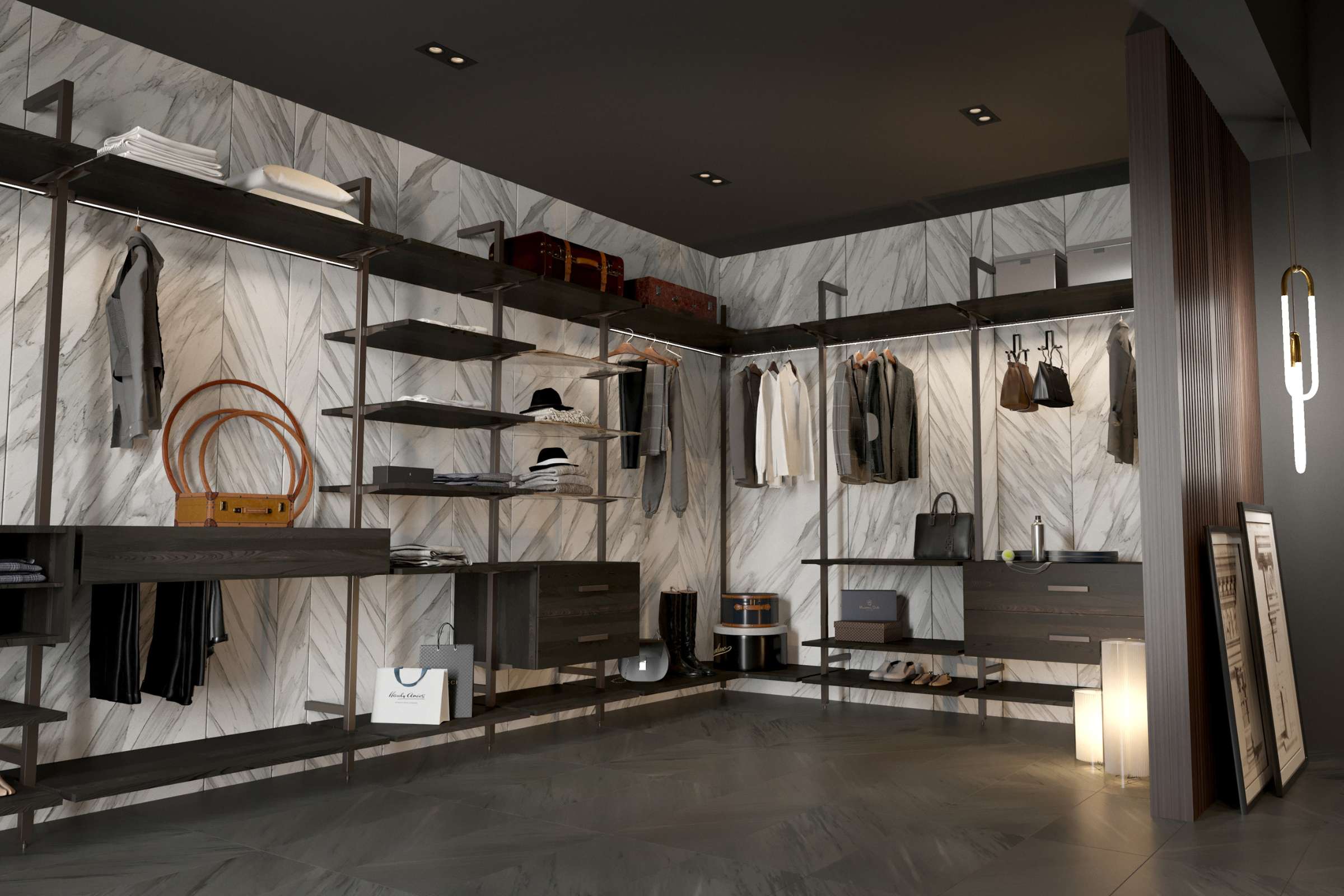 Space represents the epitome of exclusive dressing, combining customized storage with well-structured organization and effortless access in a sophisticated walk-in environment. This classic and elegant system features adjustable height shelves without visible grid systems, creating clean lines reminiscent of refined Italian design.